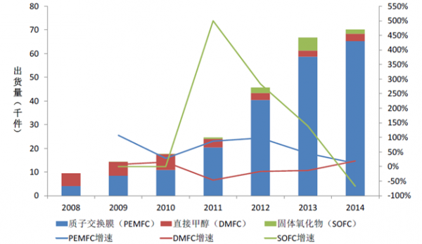 目前市場上的燃料電池一共有5 種,分別是質子交換膜燃料電池(PEMFC)、固體氧化物燃料電池(SOFC)、堿性燃料電池(AFC)、熔融碳酸鹽燃料電池(MCFC)和磷酸鹽燃料電池(PAFC)。其中AFC,PAFC,MCFC 屬于第1-3 代燃料電池,在市場上已經逐步被性能更優異的第4SOFC 和第5 代PEMFC 代替。其中SOFC 更適用于工業發電設備,目前主要用于分布式發電及余熱供熱,未來有望成為主力發電設備,而PEMFC 主要應用在交通運輸和一些固定式領域,是目前交通能源領域方面最備受矚目的燃料電池。從出貨量我們也可以看到,質子交換膜燃料電池是增長勢頭最猛同時也是占比最大的燃料電池類型。