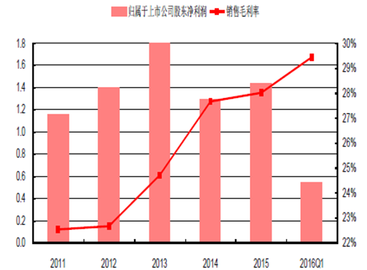 2015年,西王食品實現營業收入22.44億元,同比增長19.97%;實現歸母凈利潤1.46億元,同比增長24.50%。2016Q1,西王食品實現營業收入6.30億元,同比增長1.99%;實現歸母凈利潤0.54億元,同比增長10.05%;受益于毛利率的持續攀升,其凈利潤彈性高于收入彈性。