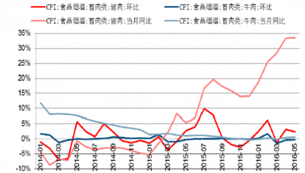 2014-2016年豬肉和牛肉價格同比及環比