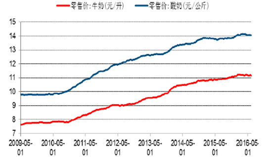 2009-2016年牛奶和酸奶零售價