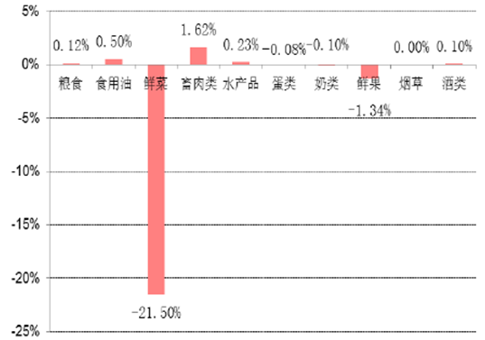 環比分類來看,5月份,食品煙酒價格環比下降1.8%,影響CPI下降約0.54個百分點。其中,畜肉類價格上漲1.6%,影響CPI上漲約0.08個百分點(豬肉價格上漲2.3%,影響CPI上漲約0.07個百分點);5月份應季鮮菜大量上市,使得鮮菜價格下降21.5%,影響CPI下降約0.64個百分點;鮮果價格下降1.3%,影響CPI下降約0.02個百分點。