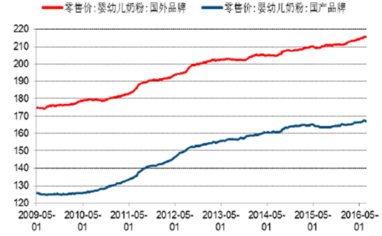 2009-2016年嬰幼兒奶粉零售價格(元/kg)
