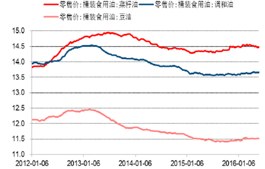2012-2016年桶裝豆油、菜籽油、調和油零售價(元/升)