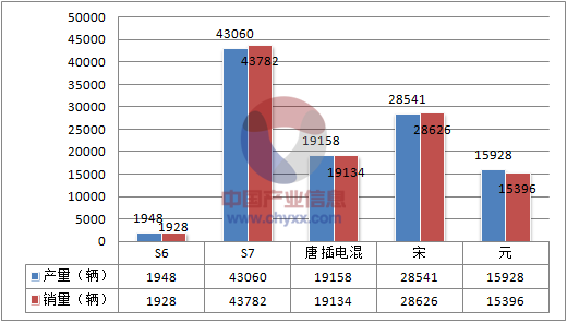 2016年1-6月比亞迪旗下SUV品牌中,S6產量為1948輛,銷量為1928輛;S7產量為43060輛,銷量為43782輛;唐插電混產量為19158輛,銷量為19134輛;宋產量為28541輛,銷量為28626輛;元產量為15928輛,銷量為15396輛。