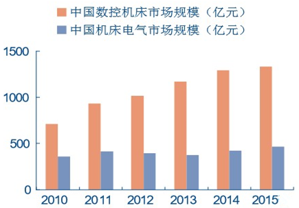 據統計,當前中國數控機床市場約 40 萬臺超千億規模,其中機床電氣市場近 400 億, 數控系統和伺服系統是機床電氣的主要部分。常規情況下每臺數控機床會使用一臺 CNC 專 用控制器作為控制部件,一臺 PLC 通用控制器作主軸控制,還有 2~3 套伺服系統完成切削 等精確位置控制。在這些核心部件的基礎上會產生一系列配套、工程設計等系統集成業務。