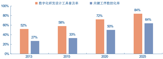《中國制造 2025》明確提出,到 2025 年中國的關鍵工序數控化率將從當前的 33%提 升至 64%,對數控系統相關的電氣伺服和 CNC 控制器是重要的驅動力。