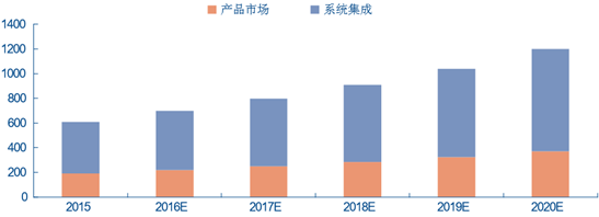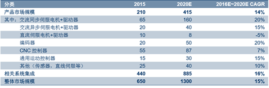 伺服控制是一個整體的系統和解決方案,核心部件包括控制器、伺服電機及驅動器等。系統集成商 根據客戶需求進行設計編程、輔件組裝、安裝調試等工作,業務量通常是核心部件的 2~2.5 倍。當前伺服控制的產品+系統集成市場約 650 億元,到 2020 年有望翻一倍達到超 1300 億元的規模。