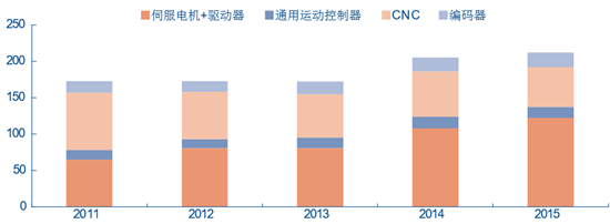 伺服控制系統的核心產品主要是 CNC、伺服電機+驅動器、通用運動控制器和編碼器。 受到整體制造業增長放緩的影響,機床數控系統 CNC(Computerized Numerical Control) 市場規模受到一定沖擊,未來在數控化率提升的驅動下有望恢復穩步上升的勢態。是該領域 最有代表性的產品市場,伺服電機+驅動器則持續快速增長,2011~2015 年間伺服電機與驅 動器的 CAGR(復合增長率)達到 20%以上。