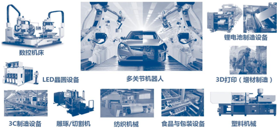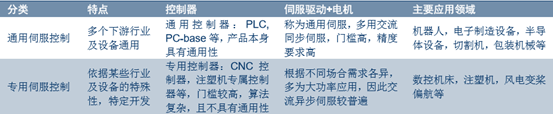 伺服控制系統的下游應用涉及所有工業裝備,而高端裝備必須通過高精度伺服系統來實現其精 密控制:一般來說,業內將機器人、電子制造設備、包裝機械等具有通用性的控制系統歸為 通用伺服控制系統;機床數控系統、風力發電機組的變槳偏航控制中的部分控制組件等由于 具有專屬性,歸類為專用伺服系統。