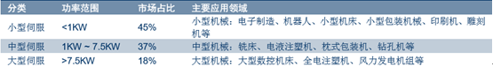 伺服的等級標準是按精度、響應速度等參數劃 分,不按常規的功率劃分:小型伺服市場需求量最大,接近 50%,在機器人、電子制造、印 刷等精益領域普遍使用,這些領域不僅需求量最大,且對伺服的精度、響應速度等參數都有 高要求,因此小型伺服是高精尖云集的領域。如蘋果產業鏈,甚至一些軍工企業,使用的都 是最高端的小型伺服;中型伺服的市場次之,約占 35%,在一些普通機床、注塑機等中大型 設備中普遍使用;大型伺服只在全電注塑機、風電機組中使用。除了某些特殊領域外,大部 分中大型伺服在精度等參數低于小型伺服,只為在高功率下滿足基本的功能。