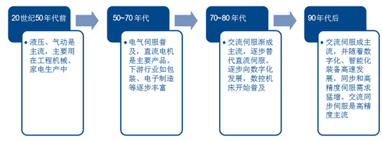 伺服的發展由來已久,早期伺服系 統是通過液壓、氣動等機械方式完成。在 20 世紀 50 年代到 70 年代,電氣伺服逐步普及, 直流電機是其主要產品。在當前高端制造的發展下,數字化交流同步伺服由于其精度高、控 制性能好的特性,需求逐步增大成為主流。