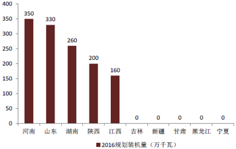 2016年Q1我國各地棄風量情況省份棄風率(%)利用小時數(小時)省份棄風率(%)利用小時數(小時)吉林53%224安徽-588新疆49%189福建-755甘肅48%294江西-467遼寧40%347河南-564黑龍江36%345湖北-472內蒙古35%475湖南-505寧夏35%264重慶-375山西19%518四川-738河北18%563陜西-540云南4%753青海-458山東3%512西藏-705北京-660廣東-399天津-568廣西-588上海-656海南-482江蘇-621貴州-355浙江-564合計26%422為應對棄風率問題,2016年風電建設規劃,河南、山東、陜西、湖南、江西、廣東、貴州、安徽、湖北等省份的規劃裝機大幅增加,增幅在百萬千瓦以上。浙江、青海、遼寧、廣西、福建等省的增幅也在50萬千瓦以上,而新疆、內蒙、寧夏、甘肅、山西、吉林、黑龍江等省份的裝機規模全部為零。風電裝機向低風速區轉移的趨勢明顯。