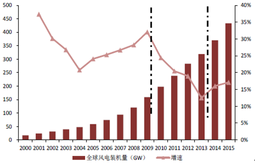 核心提示:受到各國的重視,2000-2015年,全球風電裝機容量從17.4GW發展到432.9GW,增加約23倍。2009-2013年間,由于行業投資過剩、政府補貼減少和棄風率的增加,我國風電行業進入調整期;2014-2015年,因中國市場&ldqu受到各國的重視,2000-2015年,全球風電裝機容量從17.4GW發展到432.9GW,增加約23倍。2009-2013年間,由于行業投資過剩、政府補貼減少和棄風率的增加,我國風電行業進入調整期;2014-2015年,因中國市場“搶裝潮”的拉動,全球風電市場重拾升勢。