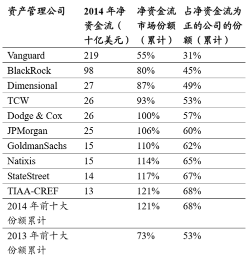 美國市場共同基金資金流的前十大資產管理公司