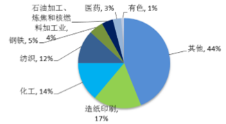 除新型煤化工、石油化工水處理市場外,其他工業廢水處理的市場也非常廣泛,主要集中在造紙印刷、化工、紡織、鋼鐵和醫藥等行業。工業水成分復雜,污染嚴重,處理成本較高。工業廢水待處理量持續增加的同時,水質排放標準也 將越來越嚴格,環保監管政策也將進一步加強。