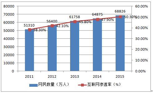 2011-2015 年中國網民數量及互聯網滲透率