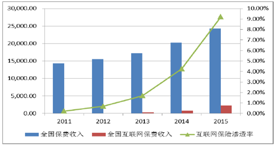 中國互聯網保險興起于2011年末,隨后幾年迎來了爆發式發展,期間保費規模增長69倍,2015年全年互聯網保險保費收入高達2234億元,在全國總保費收入中滲透率達到9.2%。