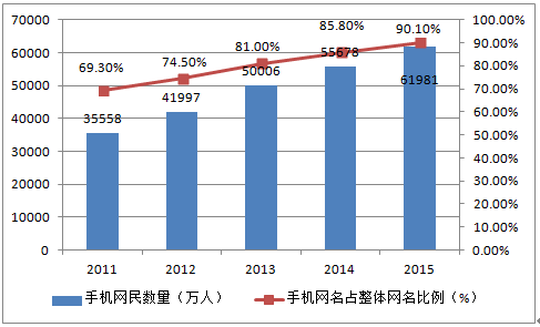 2011 -2015 年中國手機網民數量及占總網民數量比率