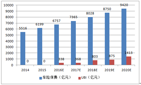 5、2015年6月,商業車險條款費率管理制度改革試點在黑龍江、山東、廣西、重慶、陜西、青島等6個地區全面落地。隨著費改在全國范圍推廣,費率形成下降趨勢,保險公司面臨盈利收窄甚至虧損的風險,自主定價需求強烈。UBI基于用戶數據,能夠科學定價、區分客戶、防范風險,有助于提升盈利能力。預測到2020年,整個車險市場規模約為9420億元。若車險費率市場化完全放開,同時伴隨著車聯網50%的新車滲透率預期,保守估計UBI的滲透率在2020年可以達到10%-15%,UBI保險面臨著1400億元的市場空間。