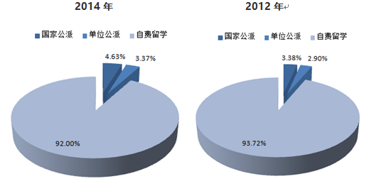 從出國留學人員構成來看,2014年度我國出國留學人員總數為45.98萬人,其中:國家公派2.13萬人,占比為4.63%;單位公派1.55萬人,占比為3.37%;自費留學42.30萬人,占比為92.00%。與2012年相比,自費留學仍是留學人員主要構成,但比重略有下降;國家公派和單位公派留學人員所占比重有所上升。
