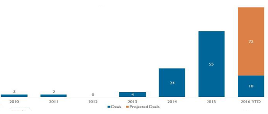 2010-2016年傳統(tǒng)保險(xiǎn)公司投資初創(chuàng)公司情況