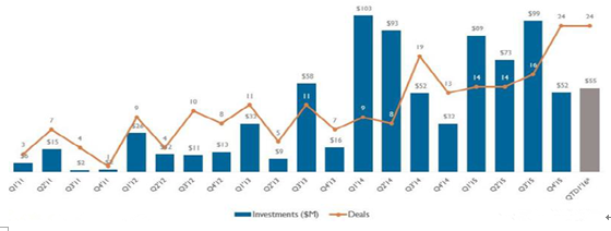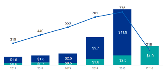 2011-2016年第一季度全球Fintech領(lǐng)域風(fēng)險(xiǎn)投資趨勢