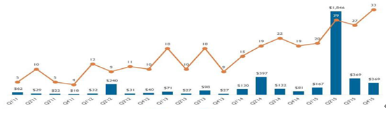 2011-2015年全球互聯(lián)網(wǎng)保險(xiǎn)偏早期風(fēng)險(xiǎn)投資趨勢