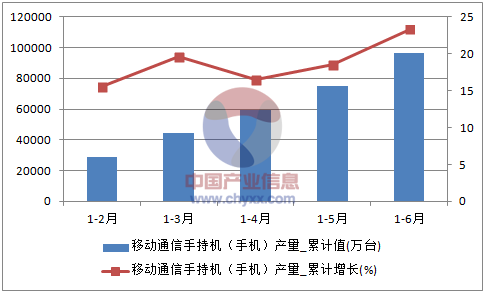 2016年1-6月全國移動通信手持機(手機)產(chǎn)量統(tǒng)計圖