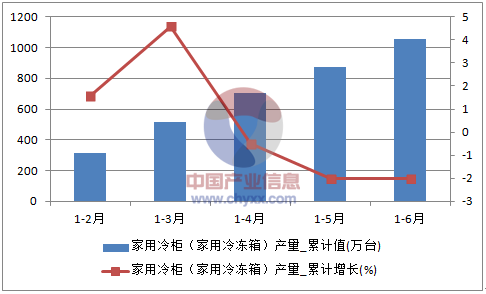2016年1-6月全國家用冷柜(家用冷凍箱)產量統計圖