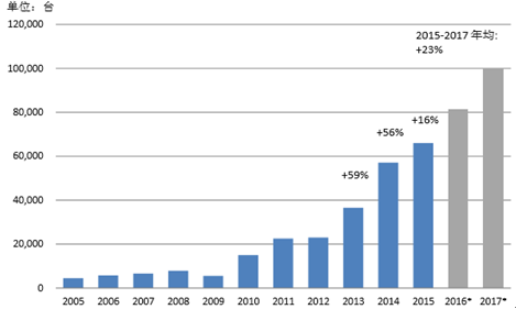 核心提示:國際機器人聯合會(IFR)數據顯示,2013 年我國工業機器人銷量 36,560 臺,全球占比 20.52%,首 次超越日本成為全球第一大工業機器人銷售國;2014-2015 年我國工業機器人銷量分 別為 57,096 臺、66,000 臺國際機器人聯合會(IFR)數據顯示,2013 年我國工業機器人銷量 36,560 臺,全球占比 20.52%,首 次超越日本成為全球第一大工業機器人銷售國;2014-2015 年我國工業機器人銷量分 別為 57,096 臺、66,000 臺,全球占比持續提升至 24.90%、26.66%,連續三年穩居 全球銷售國第一。據 IFR 預測,到 2017 年我國工業機器人銷量將達 10 萬臺,對應 2015-2017 年的年 均增長率為23%,我國工業機器人市場在問鼎全球第一后仍將保持較好的發展勢頭。