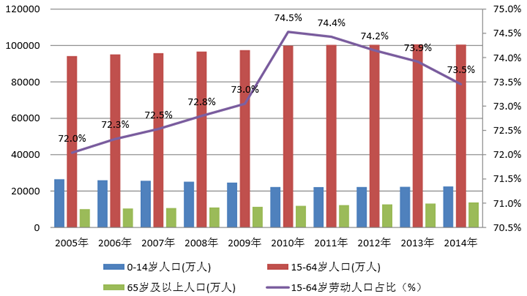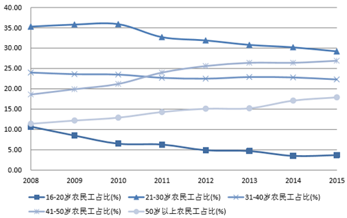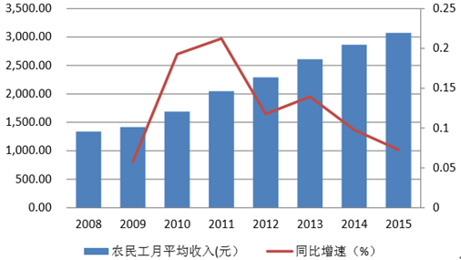 隨著年輕一代觀念意識的轉變, 愿意從事重復性、基礎性密集勞動的青年人群越來越少,41 歲以上農民工占比從 2008 年的30%已迅速攀升至 2015 年的 45%,年輕人群占比卻在不斷縮減,農民 工群體“高齡化”趨勢明顯,實際勞動力供給形勢要更為嚴峻。。2015年我國農民工月均收入超3000元,較5年前近乎翻倍, 對應企業用工成本的水漲船高,而隨著勞動人口供給的進一步減少,未來企業用工 成本將繼續上升。