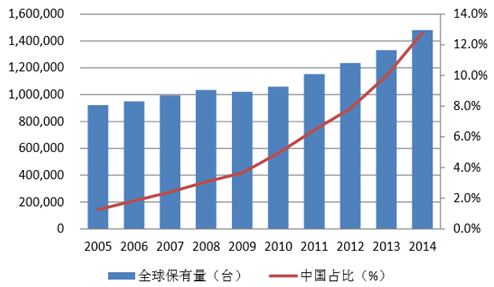 數據顯示,2014 年全球工業機器人保有量達 148 萬臺,我國保有量為 18.9 萬臺,全球占比12.8%,首次超越韓、德,僅次于日本和美國。工業機器人的使用壽命為 10-12 年,據此可估 算 2015 年全球工業機器人保有量在 170 萬臺左右,我國保有量約為 25 萬臺,全 球占比約 15%,全球占比進一步提升。