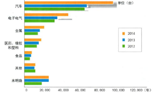 工業機器人廣泛應用于汽車、機械加工、電氣/電子、橡膠及塑料、食品加工等諸多行業,當前尤以汽車行業為最主要的應用領域,2014 年全球超過 40%的工業機器人 流向了汽車行業。從全球主要的工業機器人需求國來看,日、韓、德、美和我國的汽車行業工業機器人 滲透率均遠超全行業滲透率,2014 年日、韓、德、美和我國的汽車工業機器人密度 為全行業總體密度的 2.4~8.5 倍之間,其中韓國以 2.4 倍差距最小,而我國以 8.5 倍 差距最為明顯。橫向比較來看,日、韓、美、德的汽車行業工業機器人密度為我國的 3~4 倍,差距仍較顯著;全行業總體密度則為我國的 4.6~13.3 倍之間,差距巨大。