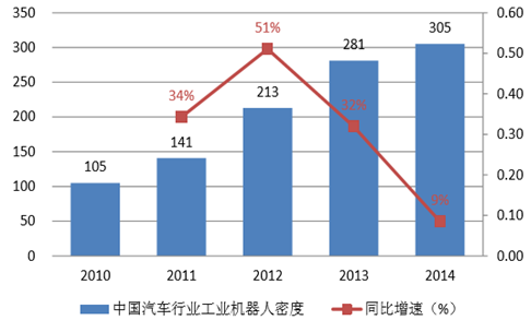 2014 年全球平均工業機器 人密度(每萬名工人使用的工業機器人數量)為 66,其中工業發達國家機器人密 度普遍超過 200。盡管經過近幾年的爆發式增長,我國工業機器人密度已由 5 年前 的 11 增加到 2014 年的36,但與工業發達國家相比仍然差距甚遠,僅達到全球平 均水平的一半左右。
