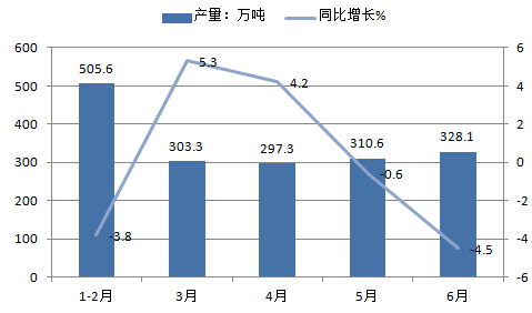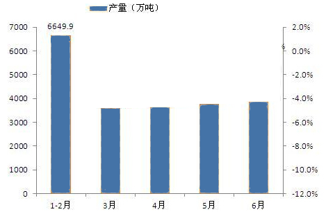 2016年上半年,全國粗鋼產(chǎn)量39956萬噸,同比下降1.1%,降幅同比收窄0.2個百分點(diǎn);6月中國粗鋼產(chǎn)量為6946.9萬噸,同比增長0.8%。