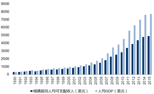 我國城鎮(zhèn)居民家庭人均可支配收入和人均GDP