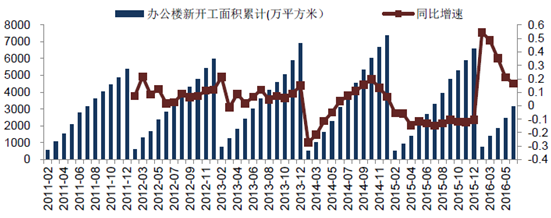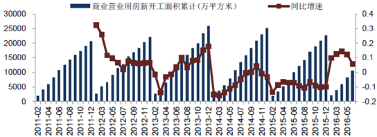 2011-2016年全國商業(yè)營業(yè)用房新開工面積累計及增速