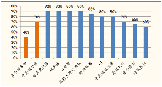 我國高端醫療器械依賴進口。我國醫療器械市場規模居世界第二,是世界醫療器械生產大國但不是強國。我國醫療器械行業整體研發投入不足,是中小型醫療器械生產國、一次性輔料產品最大生產國,許多中低端產品產量已居世界第一,但大型醫療器械基本依賴進口,受到國外巨頭的控制,目前我國醫療器械市場中低端產品占75%,中高端產品占25%,而70%的高端產品市場由通用(GE)、飛利浦(Philips)、西門子(Siemens)等外資企業占領。
