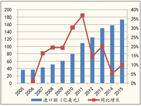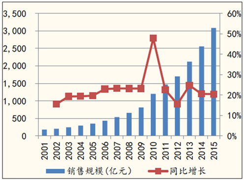 我國醫療器械市場起步晚,但增速較快。受制于我國特有的“以藥養醫”醫療模式影響,我國醫療器械行業起步較晚、規模較小。但近年來隨著國家政策扶持和醫療模式改變,我國醫療器械市場增速很快,中國醫療器械銷售額從2001 年的179 億元增長到2015 年的3080 億元,年均復合增長率高達22.54%,遠遠高于世界醫療器械不足5%的年均增速。