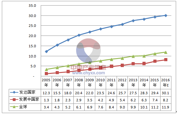2015年非洲及不發(fā)達(dá)國家固定寬帶普及率仍小于1%。近年來,中國固定寬帶普及率迅猛增長,是亞太地區(qū)主要增長點,到2016年底,亞太地區(qū)固定寬帶普及率有望超過10%。