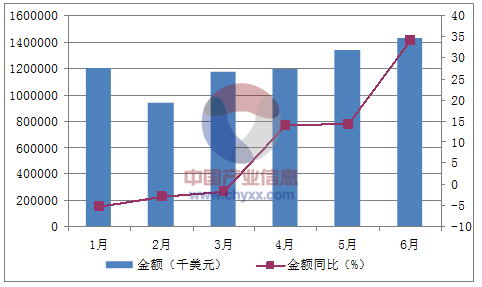2016年1-6月中國存儲部件出口金額統(tǒng)計(jì)圖