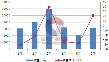 月份數量(噸)金額(千美元)數量同比(%)金額同比(%)1月6,1897,508-41.3-31.72月8,04710,070-22.5-13.53月11,85212,3123925.64月6,4117,849-34-32.75月4,2094,637-37.6-34.76月6,4027,40220.916數據來源:中國海關,中經先略數據中心整理