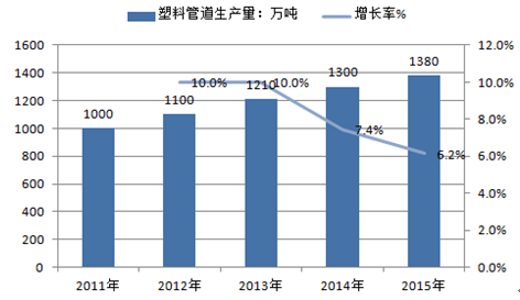 面對(duì)復(fù)雜嚴(yán)峻的國(guó)內(nèi)外經(jīng)濟(jì)環(huán)境,在國(guó)內(nèi)經(jīng)濟(jì)下行壓力持續(xù)加大、房地產(chǎn)市場(chǎng)低迷等多重困難背景下,2015年,塑料管道行業(yè)快速發(fā)展勢(shì)頭繼續(xù)放緩,增幅略有下降。但在國(guó)家相關(guān)市政工程、水利工程、農(nóng)業(yè)、工業(yè)和建筑業(yè)等行業(yè)市場(chǎng)需求引領(lǐng)下,塑料管道行業(yè)取得了一定的增長(zhǎng)。至2015年底,全國(guó)塑料管道生產(chǎn)量為1380萬(wàn)噸,增長(zhǎng)率為6.15%。2011-2015年全國(guó)塑料管道生產(chǎn)量