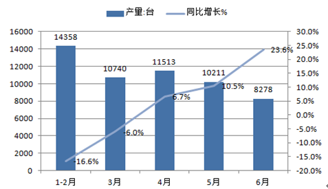 2016年1-6月中國挖掘機產(chǎn)量規(guī)模