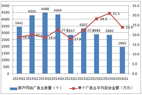 2014Q1-2016Q1中國房地產網站廣告主數量及平均投放額