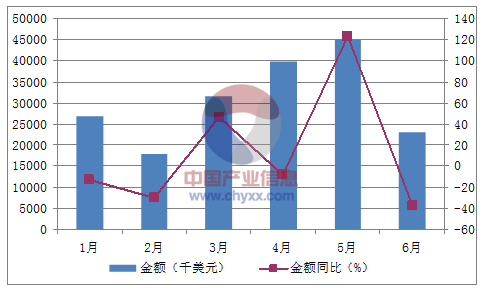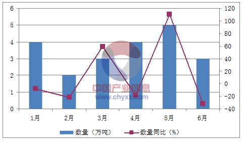 月份數(shù)量(萬噸)金額(千美元)數(shù)量同比(%)金額同比(%)1月426,880-8.3-12.82月218,028-21.2-29.73月331,51959.346.34月439,898-18.5-7.85月545,106110.8123.26月323,159-31.8-37.5數(shù)據(jù)來源:中國海關,中經(jīng)先略數(shù)據(jù)中心整理