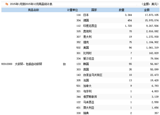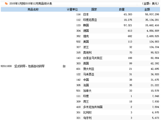 2015年主要貿易國鋼琴進出口情況分析