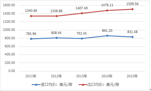 年度貿易金額:美元數量:架2011進口$68,622,43687,3102011出口$67,042,52950,0072012進口$82,622,186102,1992012出口$57,605,37043,0252013進口$92,551,934116,7922013出口$46,542,79233,0682014進口$108,089,736125,5102014出口$42,942,98129,0332015進口1171558541409002015出口3761060524915資料來源:公開資料整理