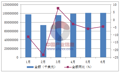 月份金額(千美元)金額同比(%)1月98178579-11.42月73490411-23.33月959593027.54月99761339-2.95月101204231-66月101427523-4.6數據來源:中國海關,中經先略數據中心整理