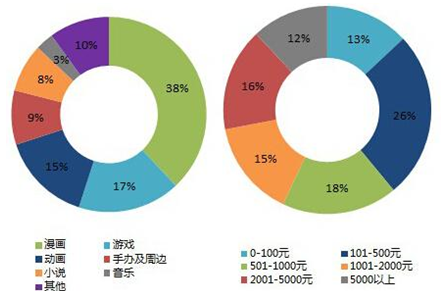 ACG用戶中,內容消費類型排名前三的依次為漫畫(38%)、游戲(17%)和動畫(15%),三者合占70%比例;39%的ACG用戶偏向于支付500元以內的金額,與此同時,支付501-1000元(18%)、1001-2000元(15%)、2001-5000元(16%)、5000元以上(12%)的人群比例分布大致接近,這表明ACG用戶的購買力較強,ACG用戶價值值得重點開發。